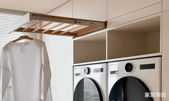 具体做法:在洗衣机的上部,安装一个伸缩的晾衣杆。平时。这个晾衣杆可以推进柜子里;洗完衣服,可以被拉开,顺手挂衣服。